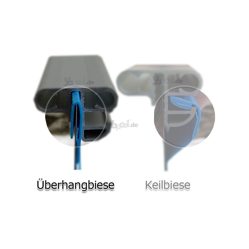 Diese Innenhülle wird mittels Überhangbiese über die bestehende Stahlwand des Schwimmbeckens gehangen und mit dem Handlauf (nicht im Lieferumfang) fixiert.